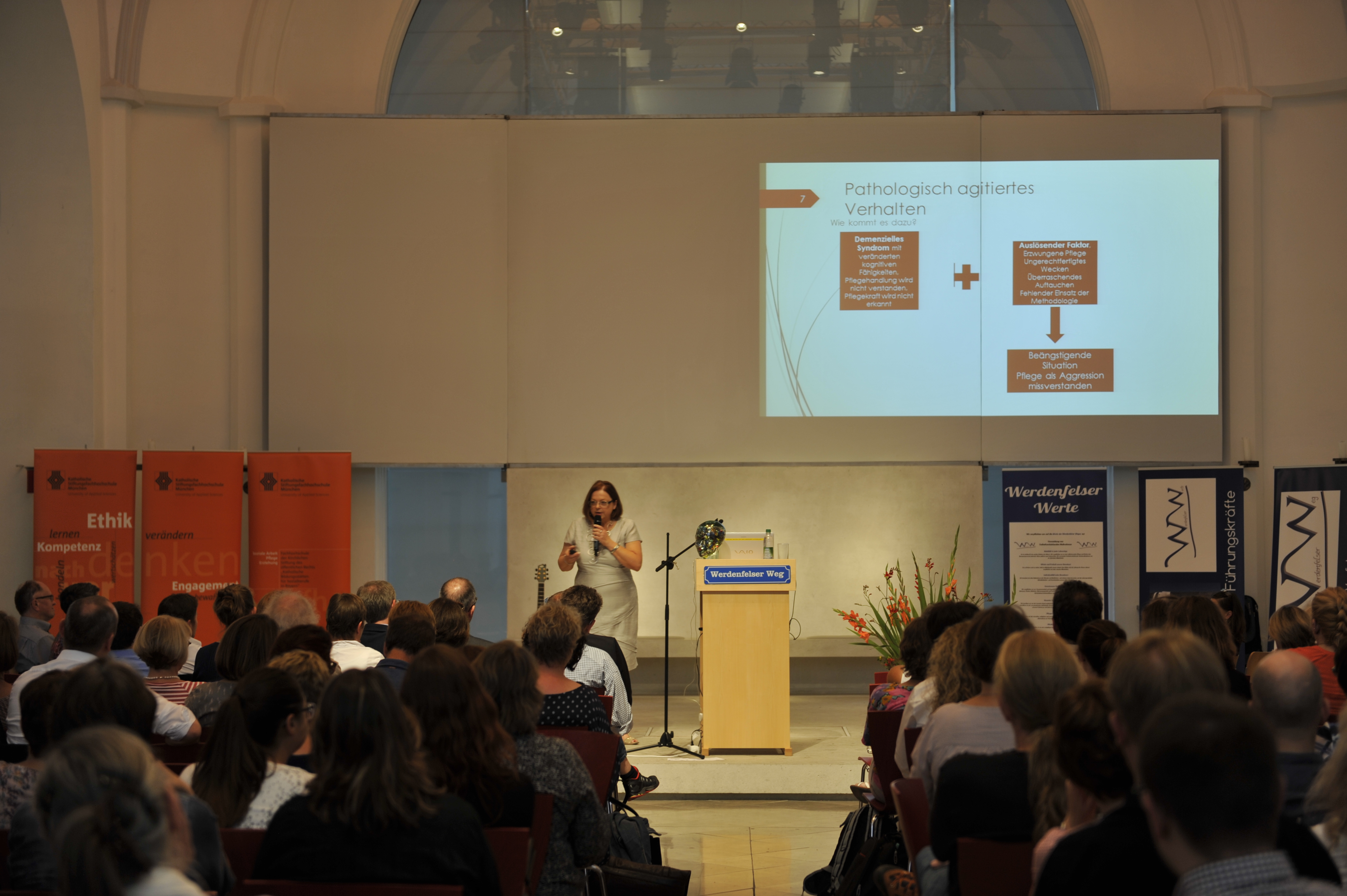 Daran anknüpfend stellte Claudia Stegmann-Schaffer aus ihrer Praxis als Leiterin eines Pflegeheimes den aus Frankreich stammenden Ansatz der „Humanitude“ dar. Für sie ist dabei „die Beziehung wichtiger als die Sedierung“: Es geht darum, sich in die Perspektive der zu pflegenden Person zu versetzen, um ein Verständnis für die möglichen Problemquellen im Umgang zu schaffen. Der Umgang ist dabei von gegenseitiger Rücksichtnahme geprägt – mit durchschlagendem Erfolg. „Es geht uns darum, dass die Bewohner verstehen, was geschieht“, wie Stegmann-Schaffer in ihrem Vortrag sagte. Dank des Einsatzes dieser „Pflege auf Augenhöhe“ in ihrer Einrichtung konnte die Medikamentengabe deutlich reduziert und gleichzeitig das allgemeine Wohlbefinden deutlich gesteigert werden. Auch diese Vorträge stießen trotz der vorgerückten Zeit und sommerlicher Temperaturen auf großes Interesse und begeisterte Zustimmung.
